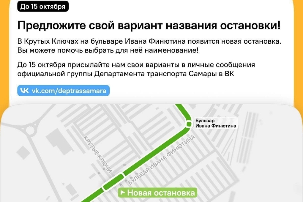 Департамент транспорта Самары приглашает жителей придумать название для новой автобусной остановкина бульваре Ивана Финютина (в домах №6 и №17).