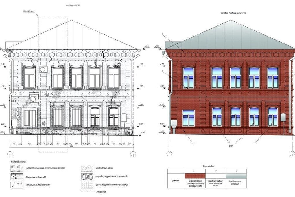 Проект восстановления фасадов предполагает укрепление стен и декоративных элементов, обновление кирпичной кладки с сохранением оригинального цвета, а также замену дверных и оконных заполнений с учетом исторического облика здания.