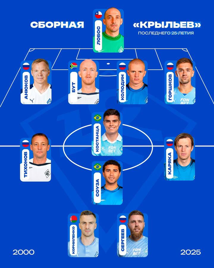 В ворота болельщики «зелено-бело-синих» поставили чилийца Эдуардо Лобоса (выступал за «Крылья» с 2005-го по 2011 год). В обороне — Александр Анюков (2000-2005, 2019-2020), южноафриканец Мэттью Бут (2004-2009), Денис Колодин (2004-2005) и Юрий Горшков (2020-2024).